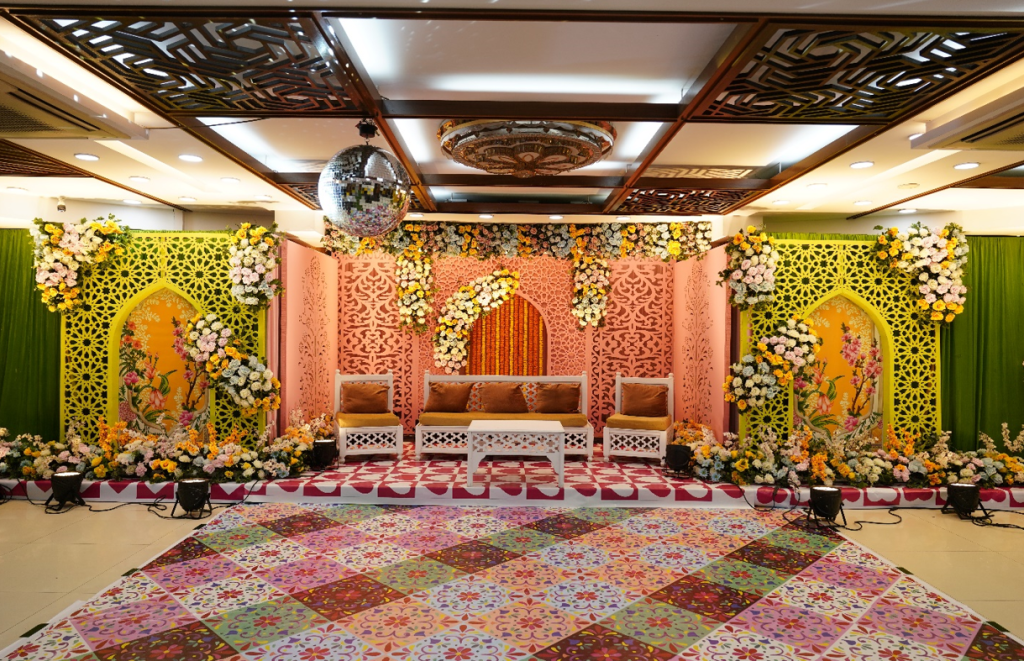 Where trends meet elegance, the soft pink dominance portrays the emotional side of the celebration, bringing ease and charm to the moment. Yellow and gold are the hearts of the night, symbolising the sacred turmeric ritual. Altogether, it’s a modern, trendy vibe blended seamlessly with tradition and ritual.